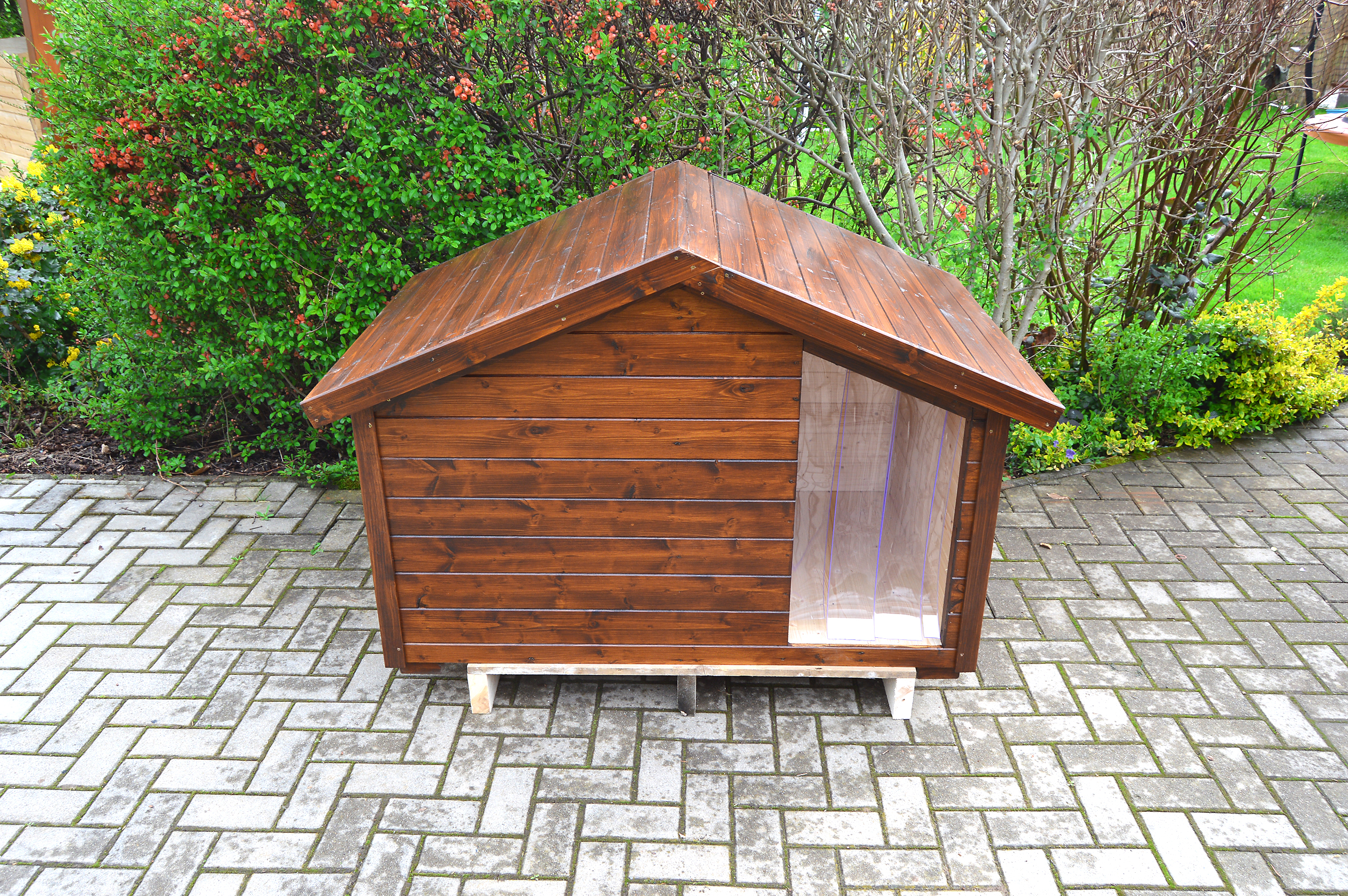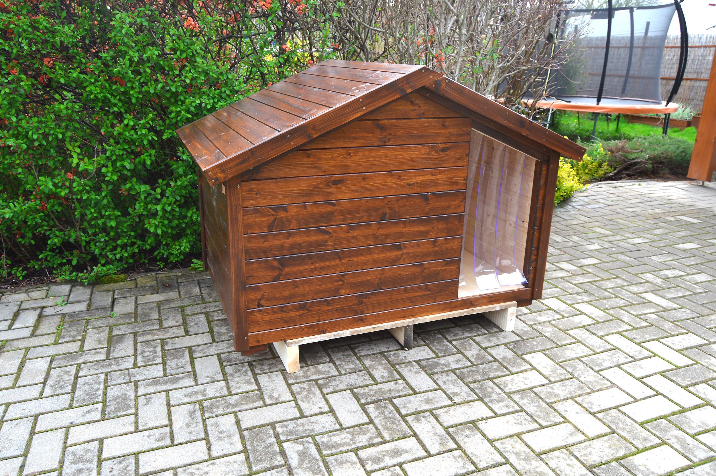 Naša kaukazská sučka má konečne poriadnu búdu. REX je priestranný a pevný, áčková strecha vyzerá štýlovo a zapadla k nášmu altánku v záhrade.