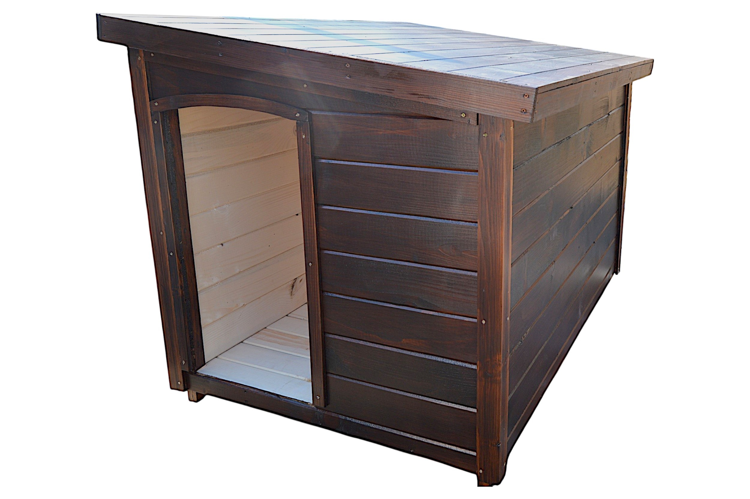 Kvalitná zateplená búda pre psa SPOT (odtieň náteru orech) so šikmou strechou so sklonom vzad a s vchodom na bočnej strane