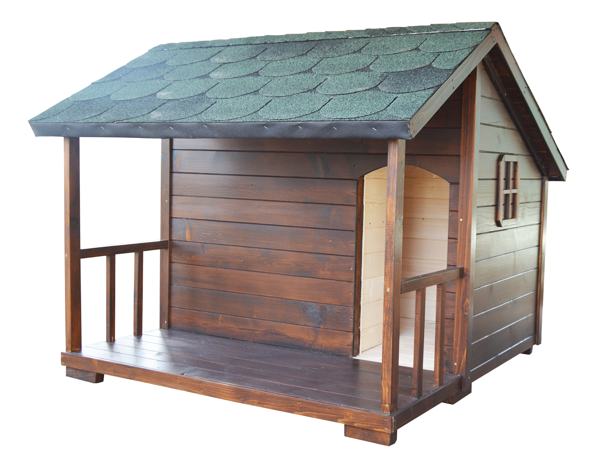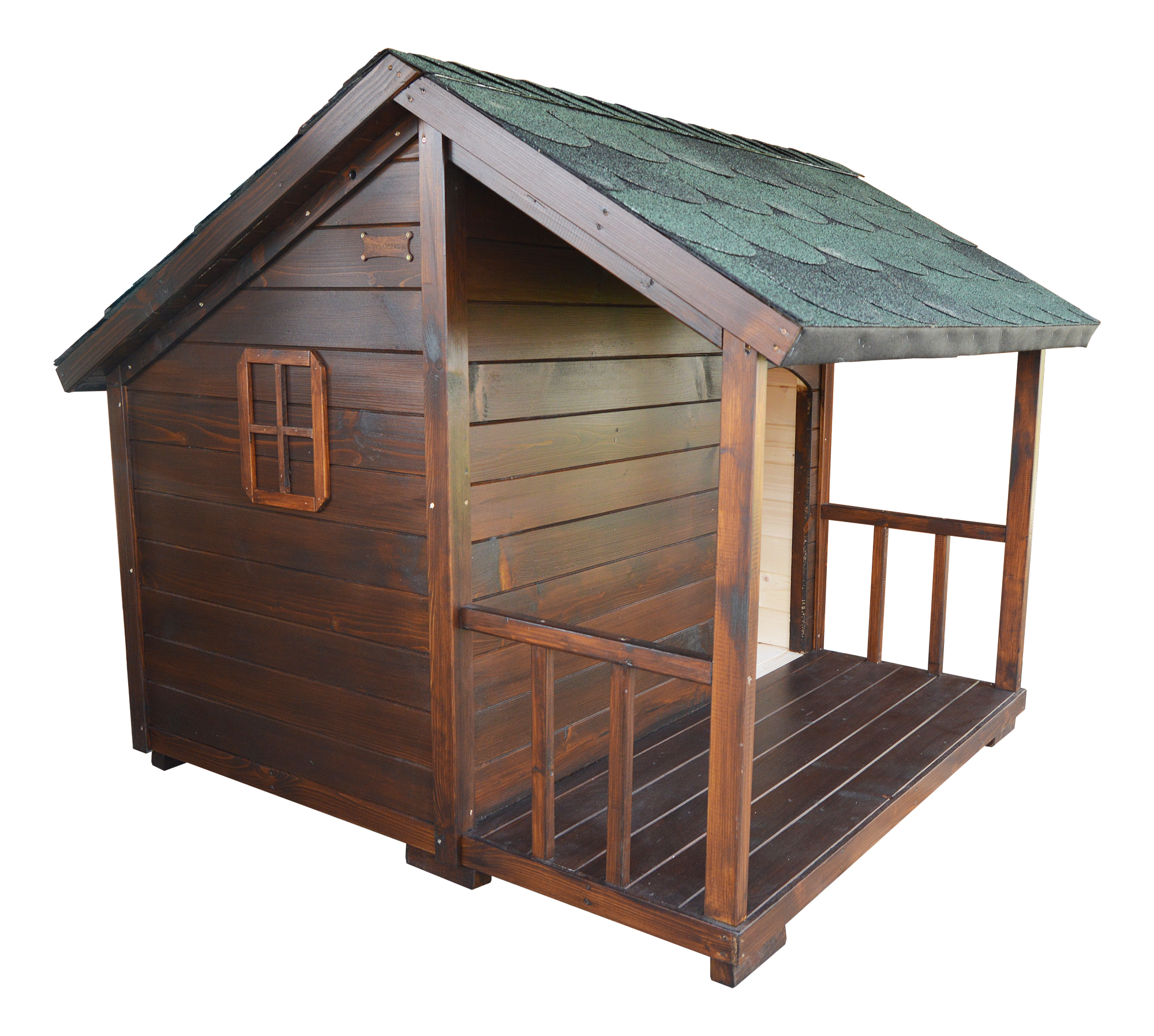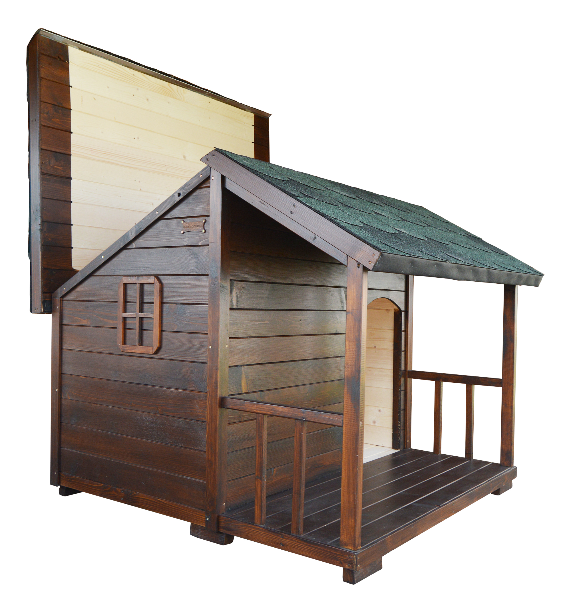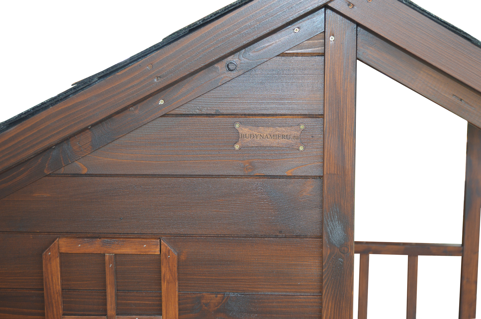 Kvalitná zateplená búda pre psa CASSIDY (odtieň náteru orech) s áčkovou strechou, terasou so zábradlím a okienkami