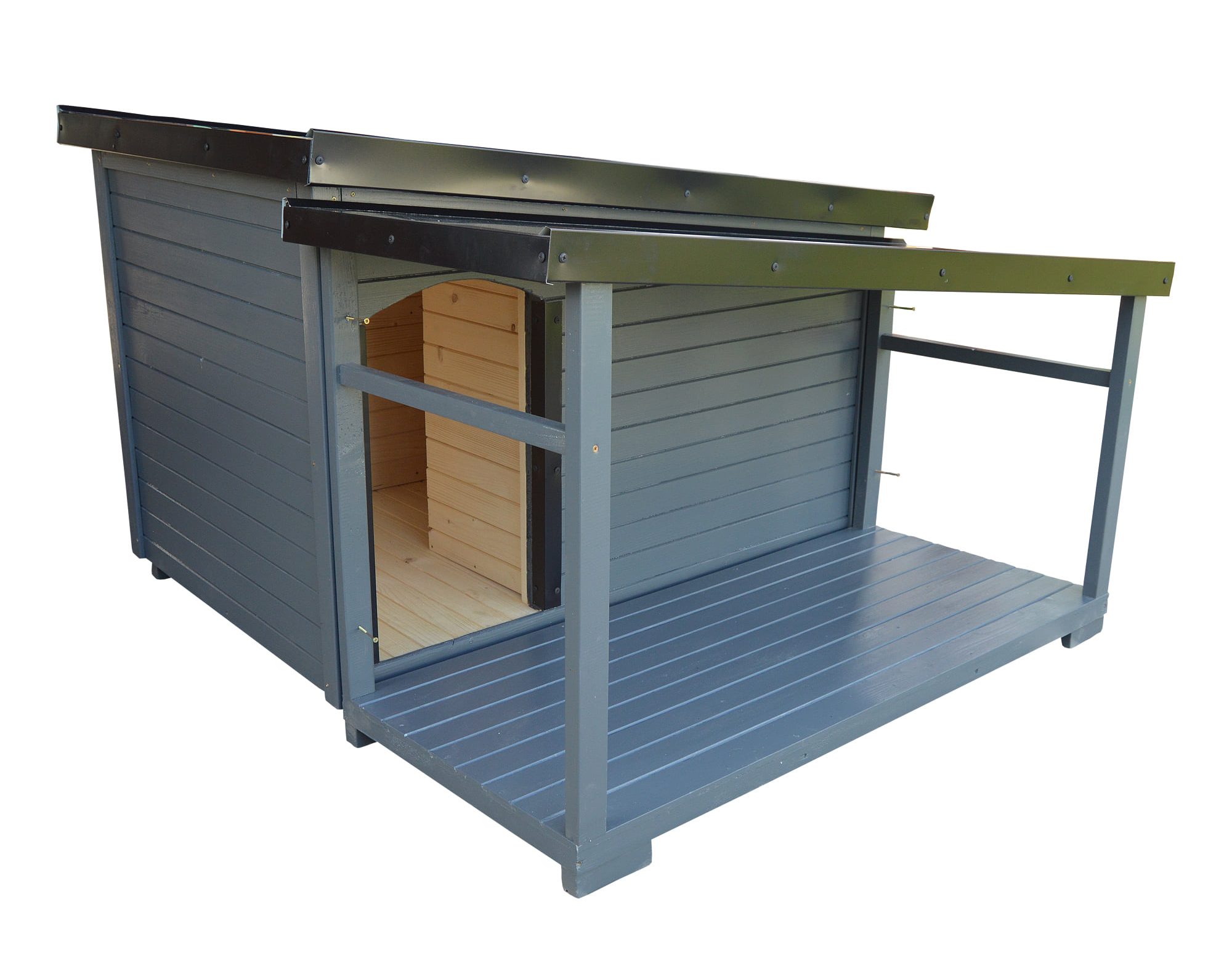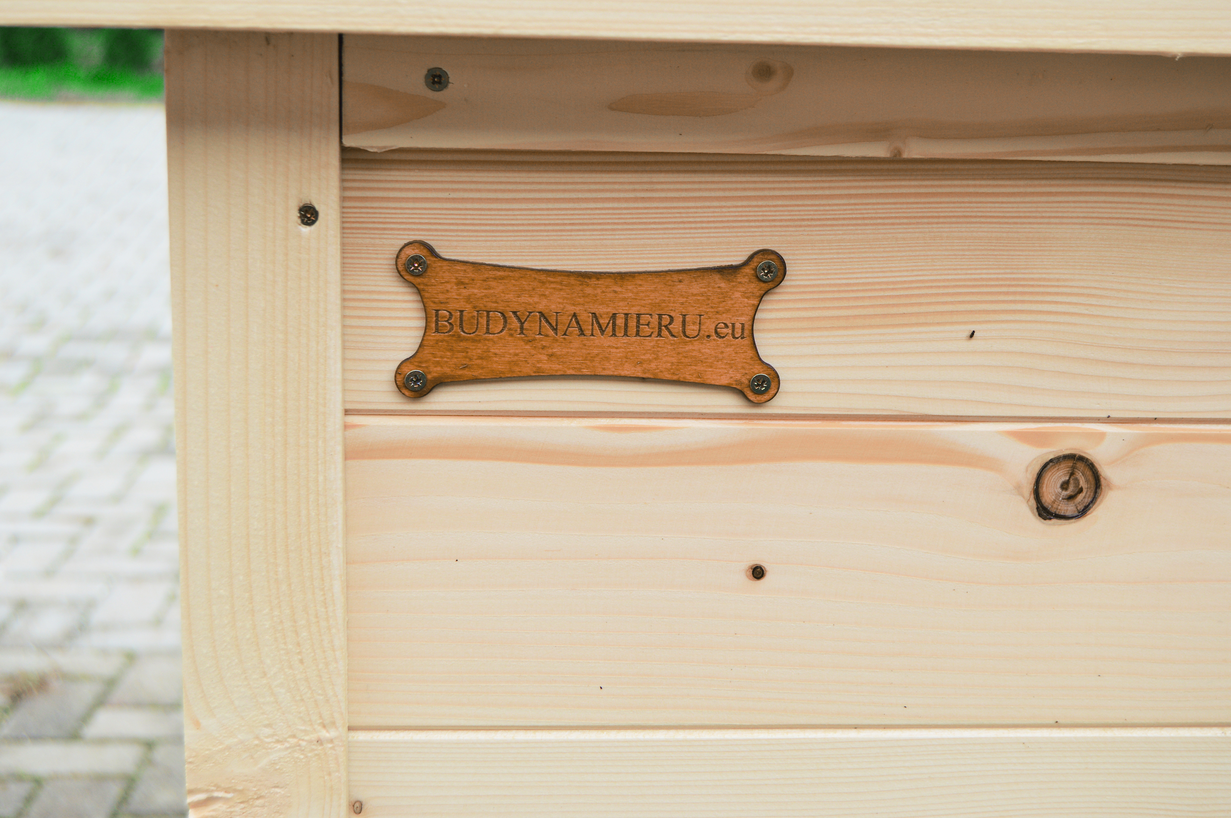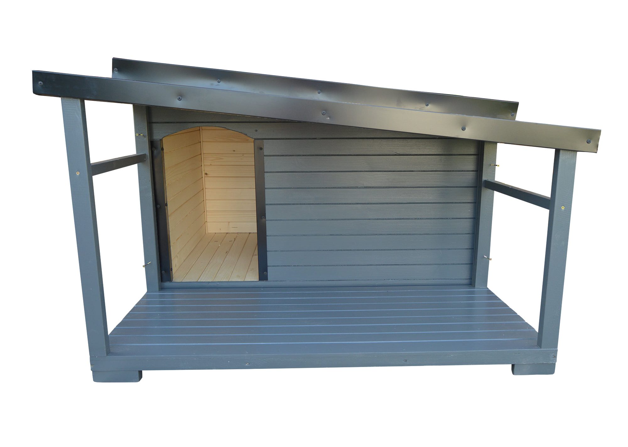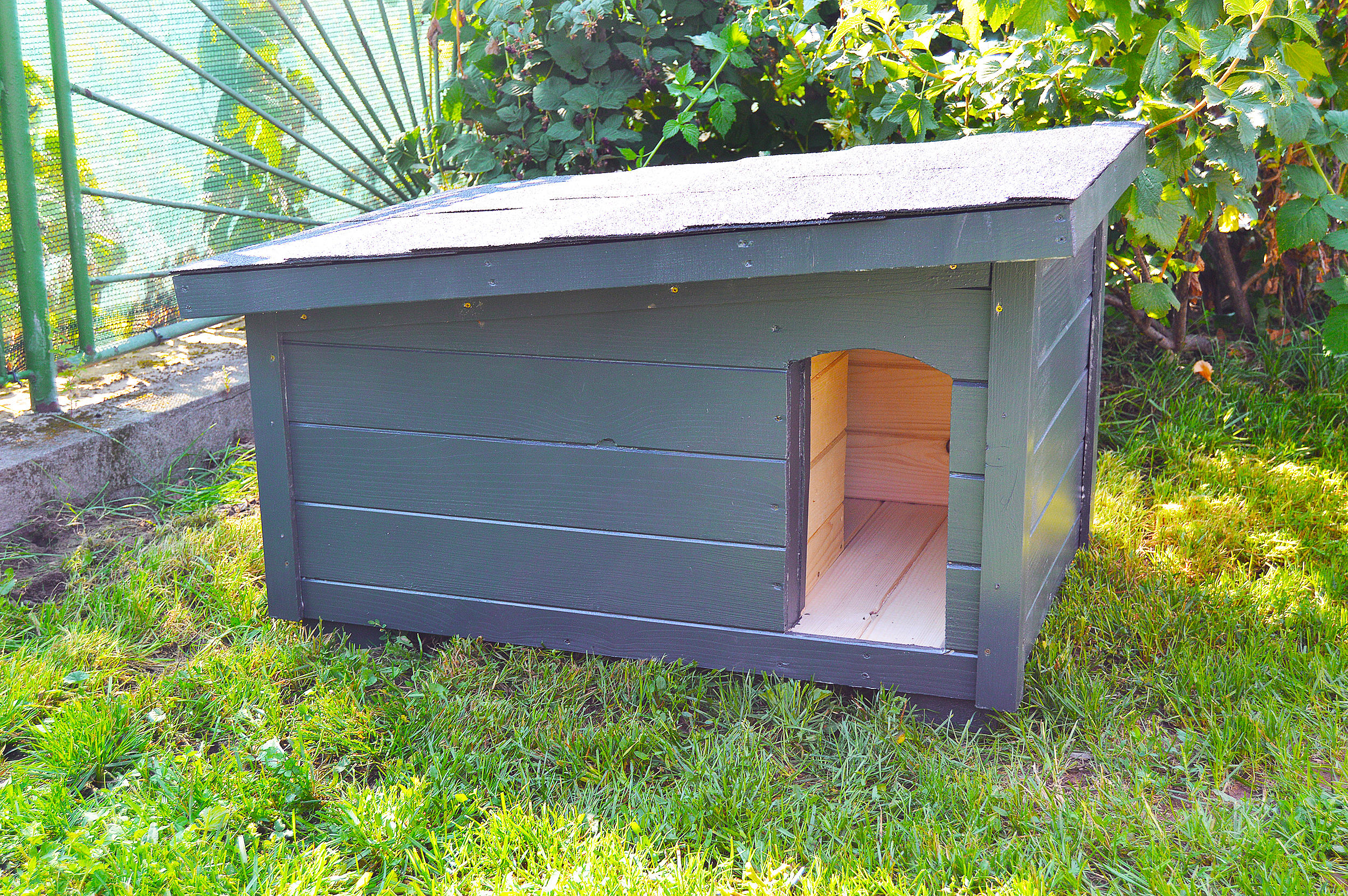 Pozrite si Zateplenú búdu pre psa MAXIM so šikmou strechou so sklonom do strany, tmavou krytinou, oplechovaním vchodu a menovkou v šedom odtieni RAL 7040 #4.