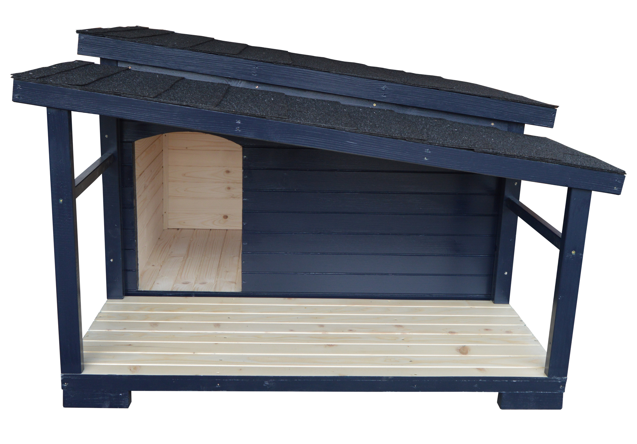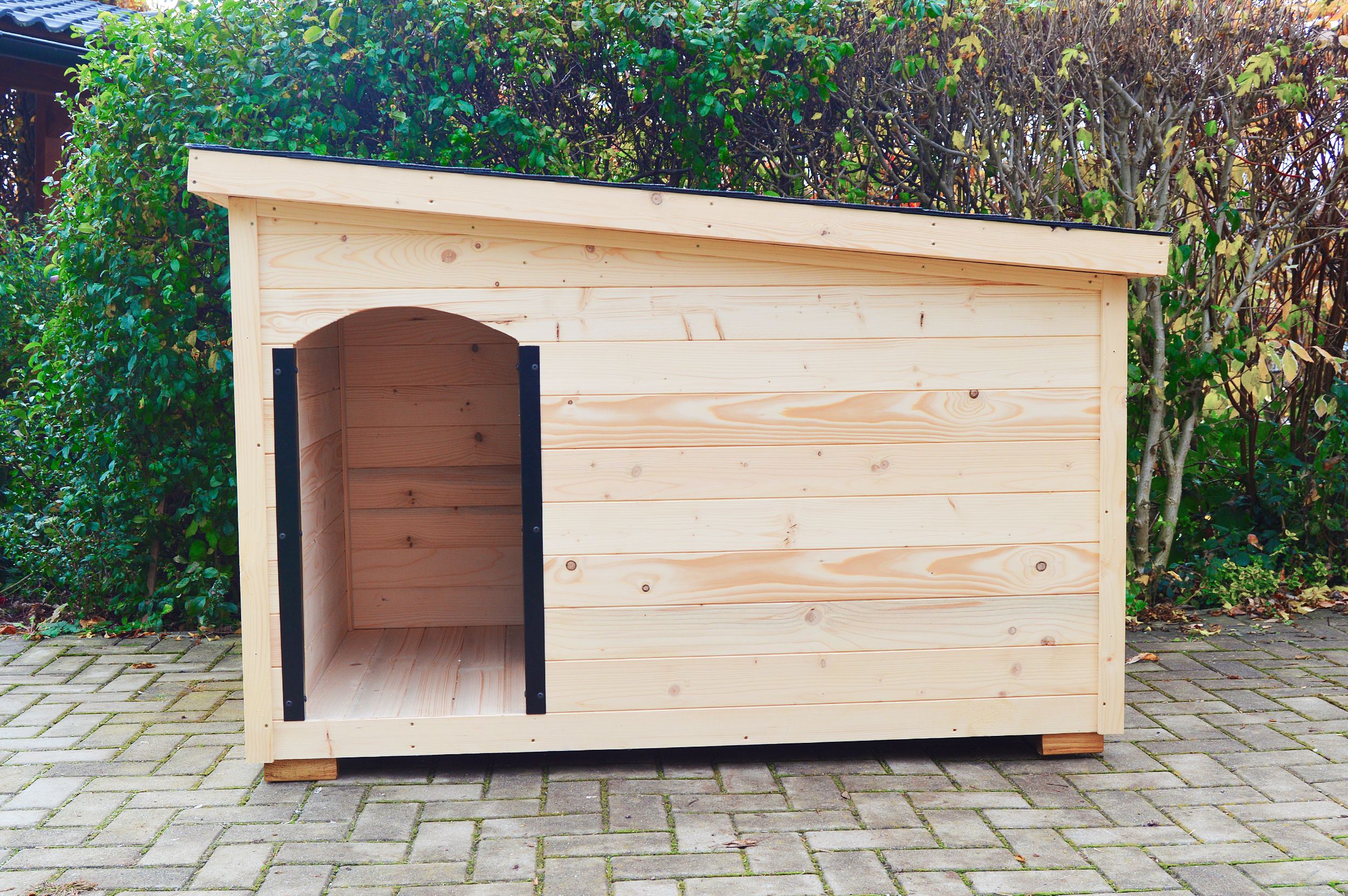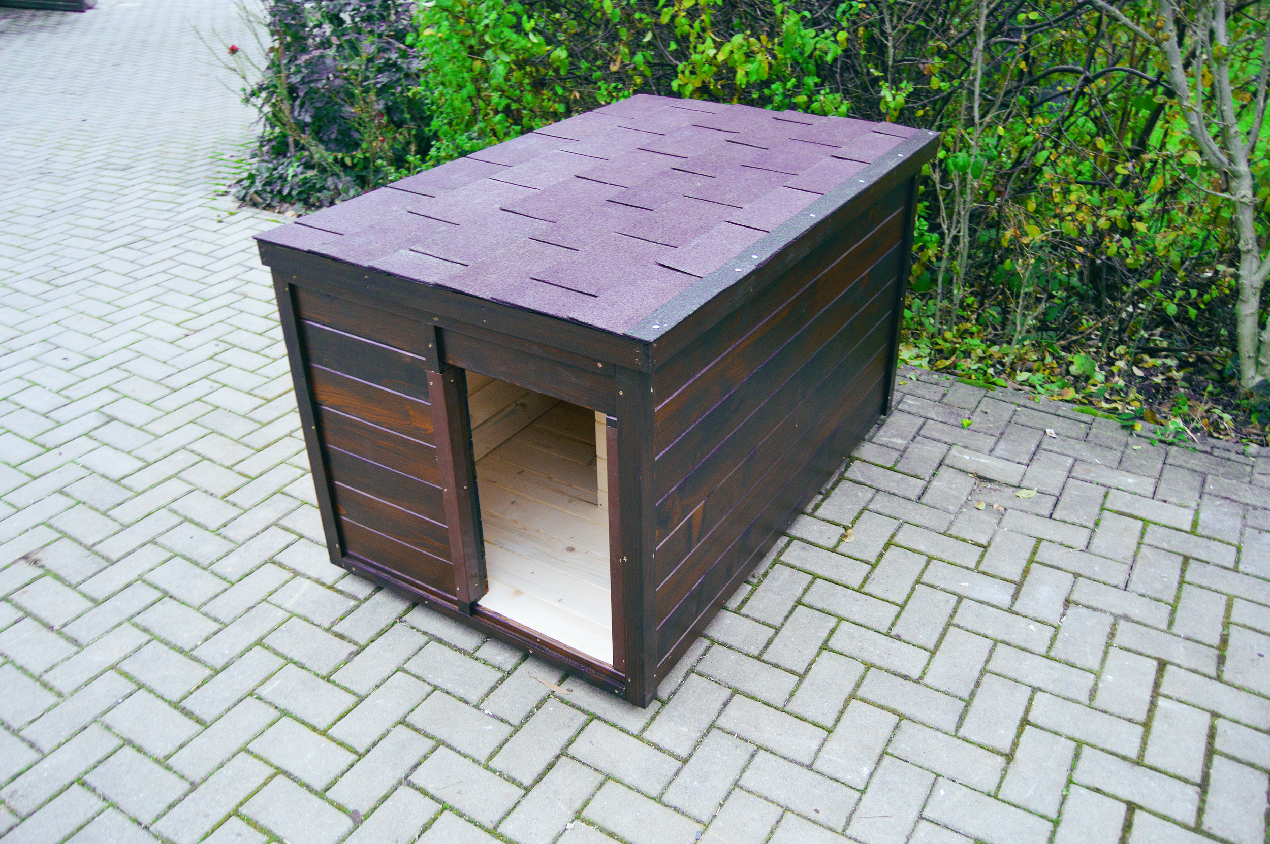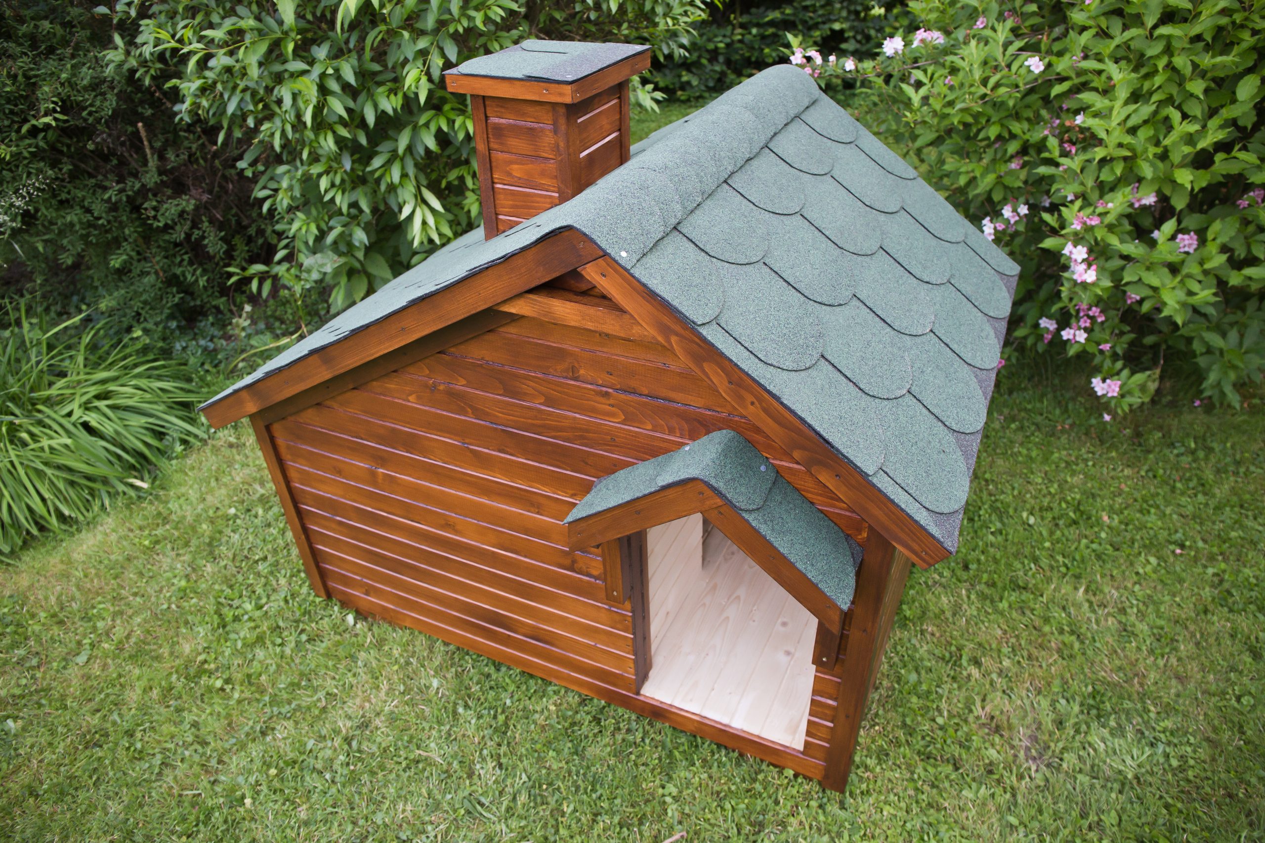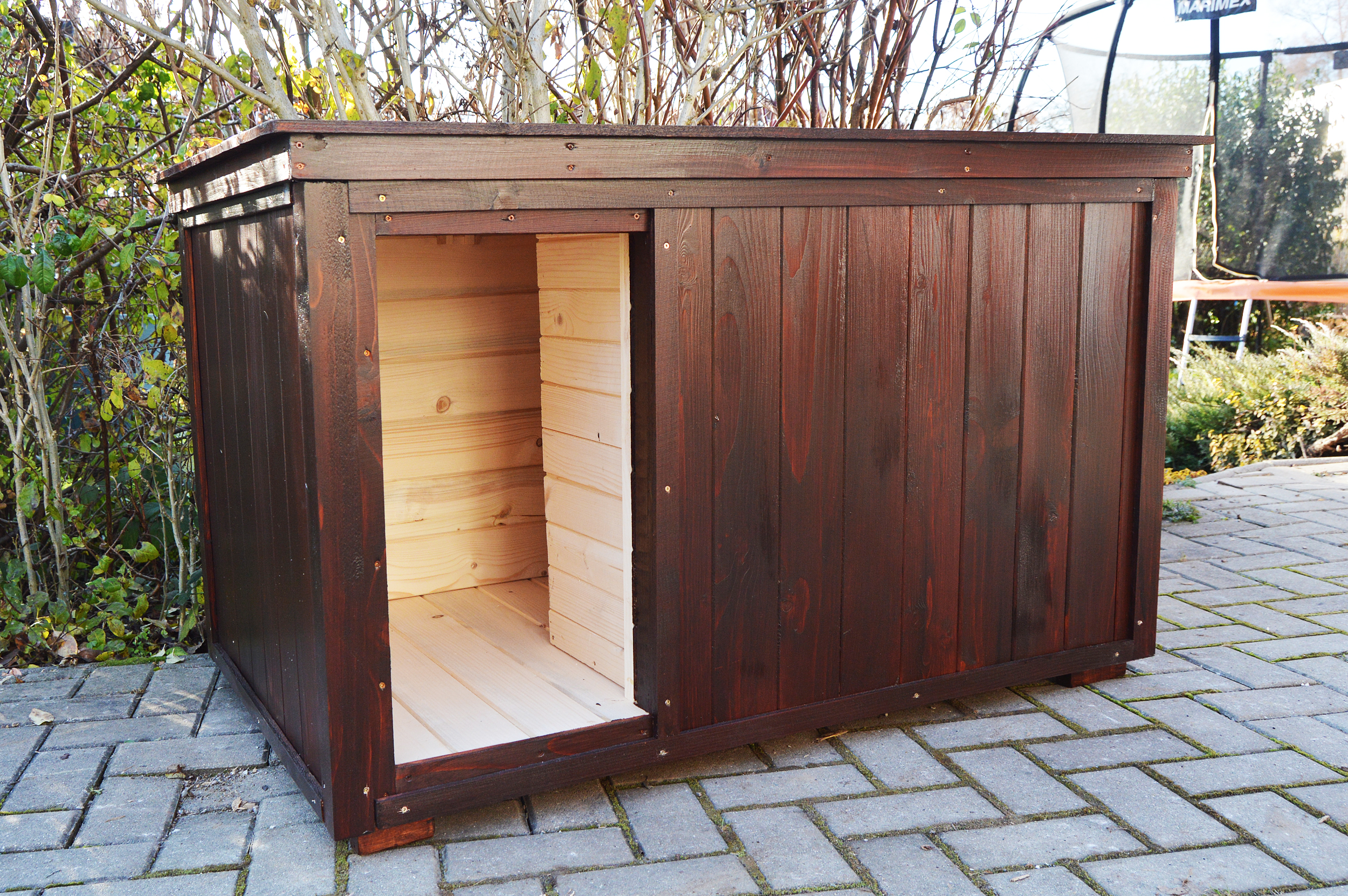 Pozrite si Zateplenú búdu pre psa MAXIM so šikmou strechou so sklonom do strany, tmavou krytinou, oplechovaním vchodu a menovkou v šedom odtieni RAL 7040 #4.