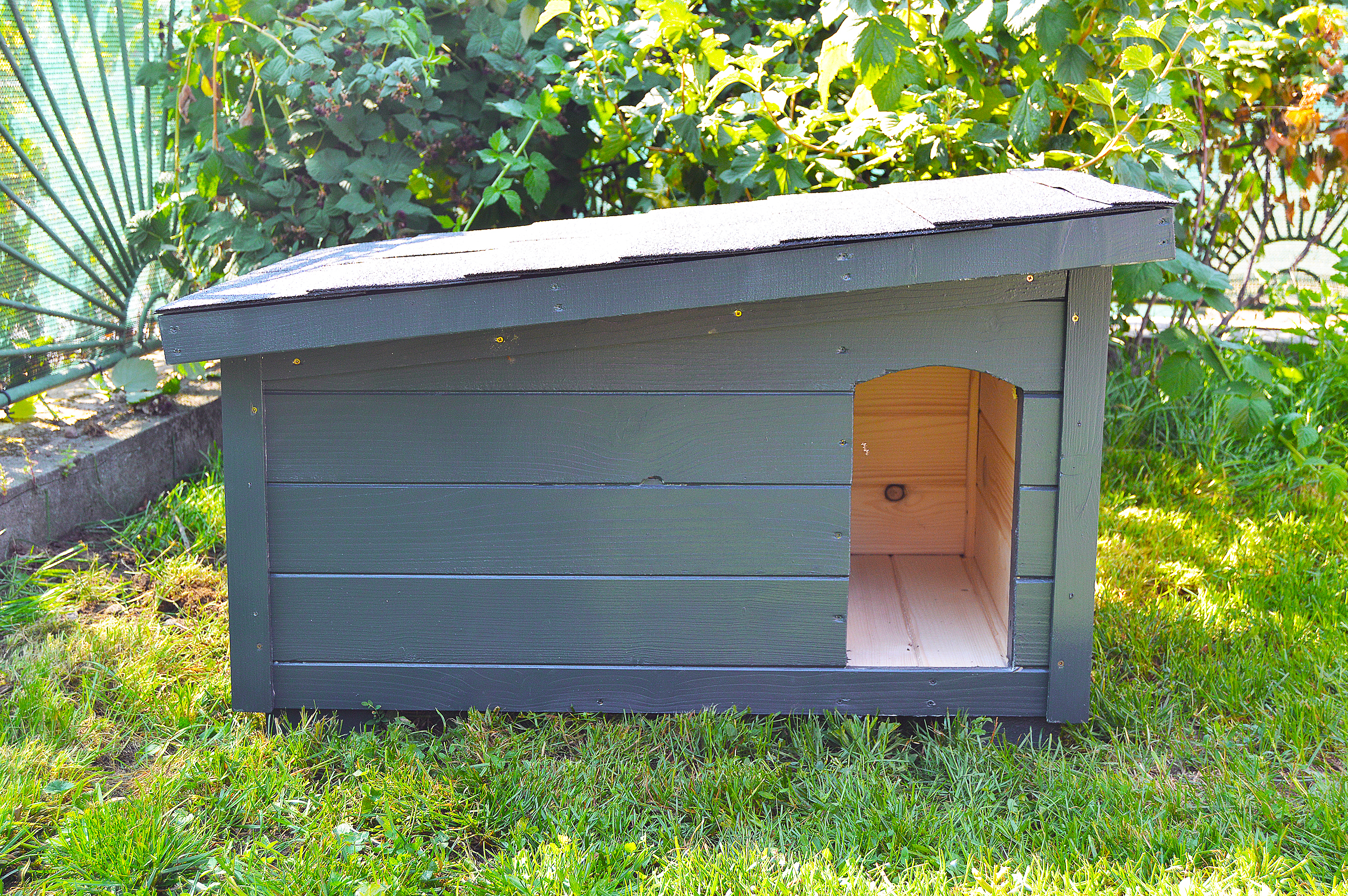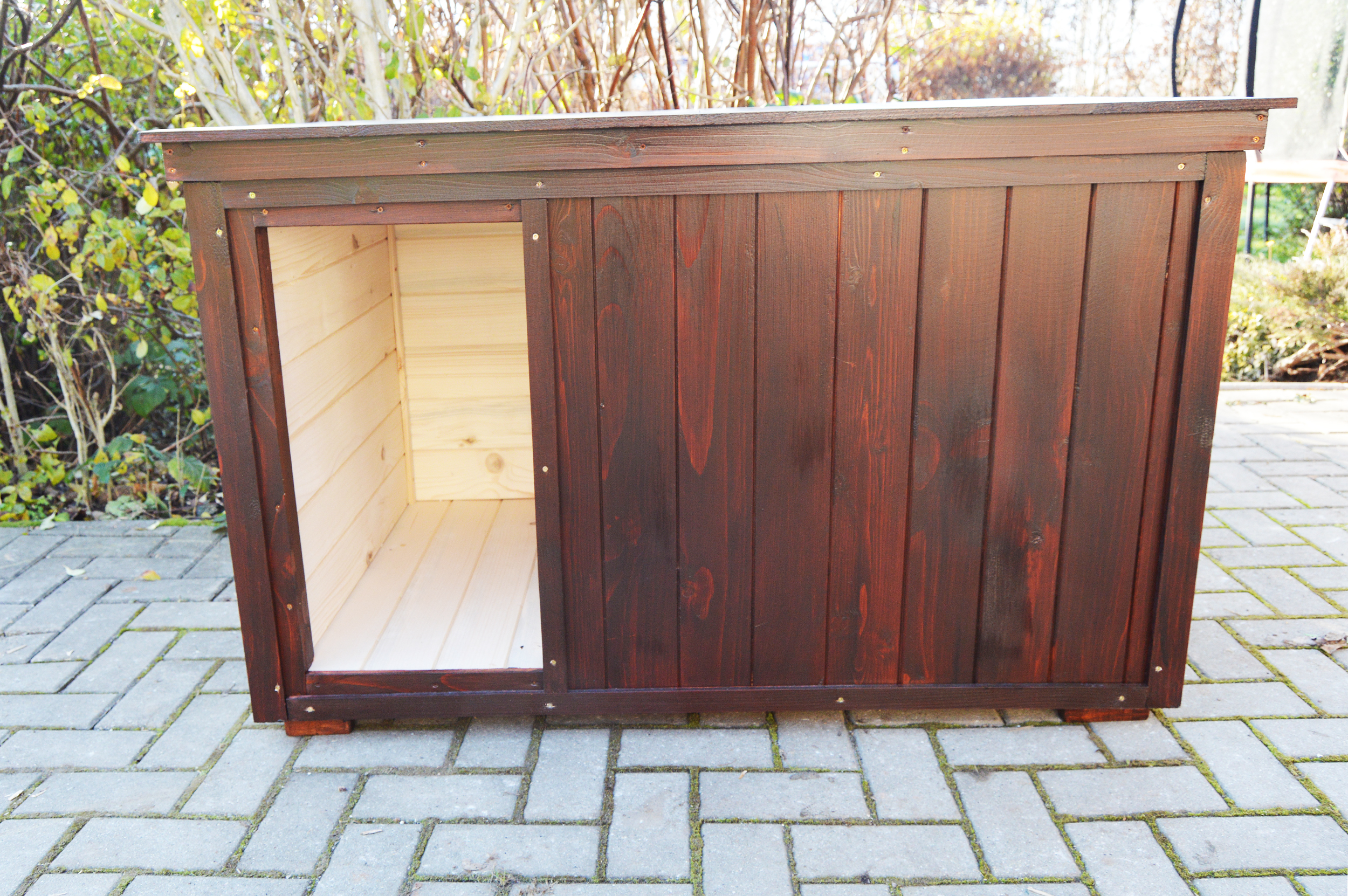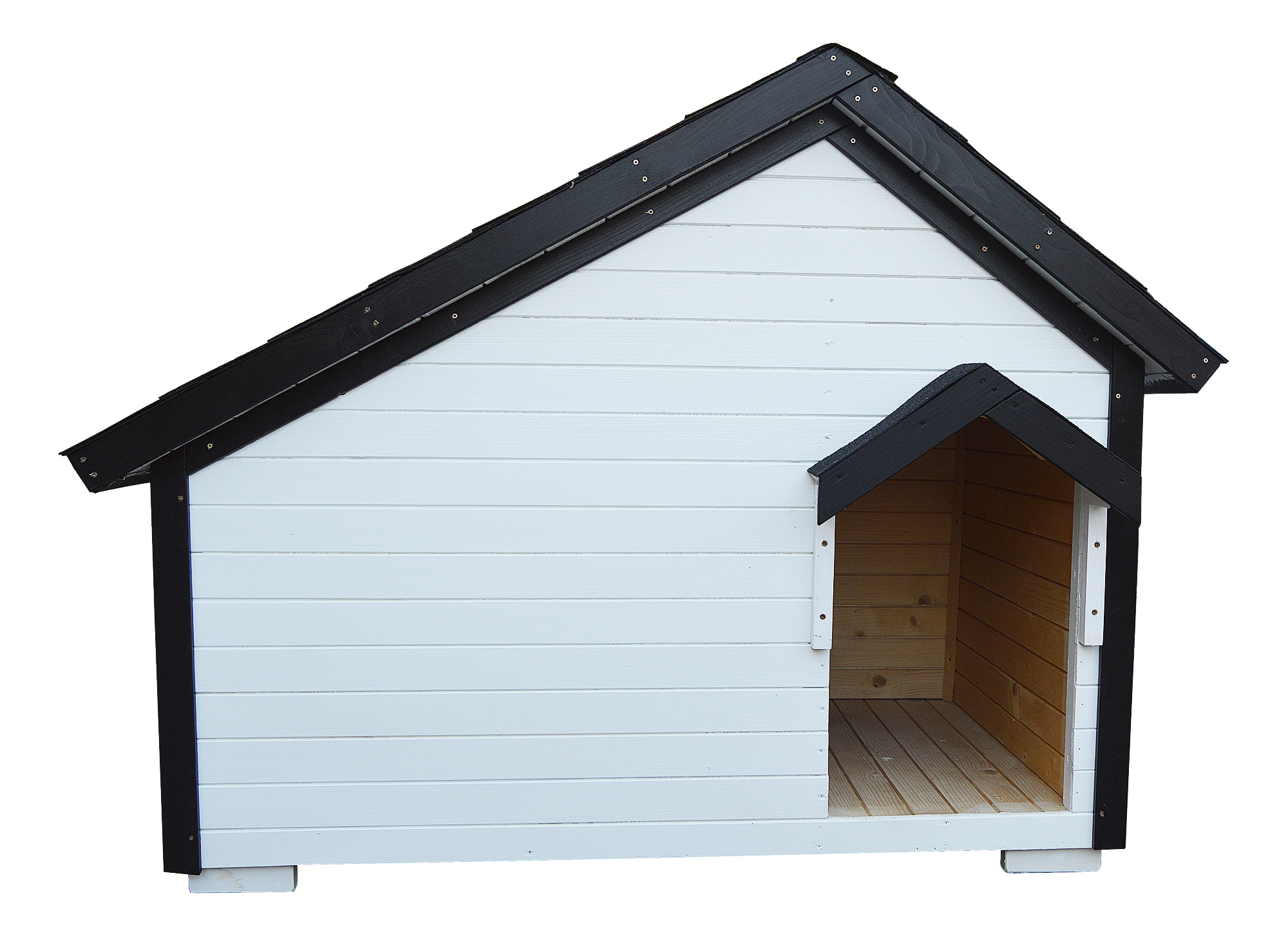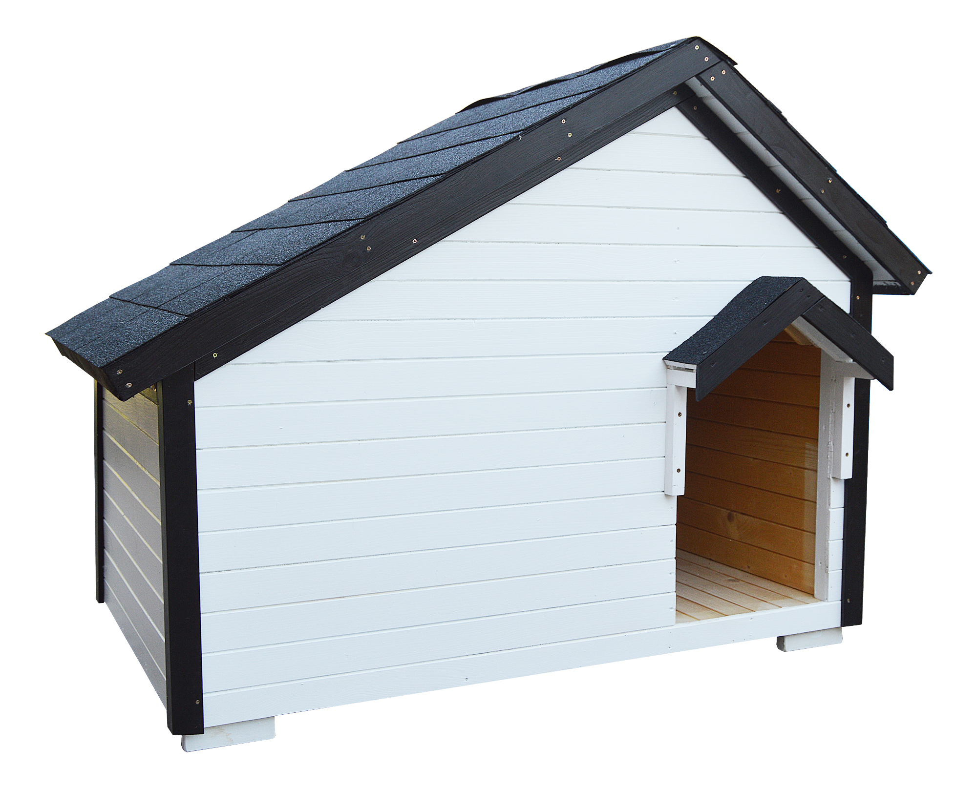Pozrite si Zateplenú búdu pre psa MAXIM so šikmou strechou so sklonom do strany, tmavou krytinou, oplechovaním vchodu a menovkou v šedom odtieni RAL 7040 #4.