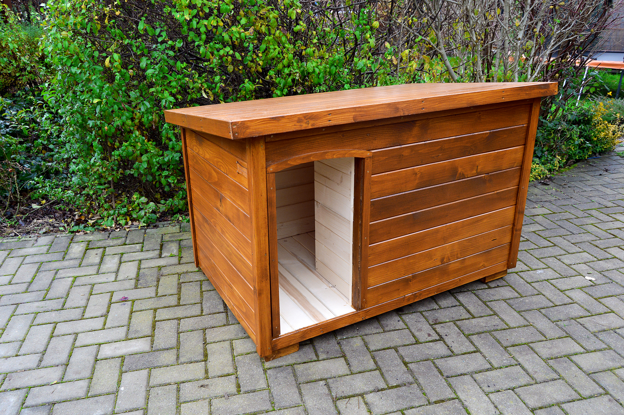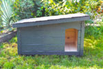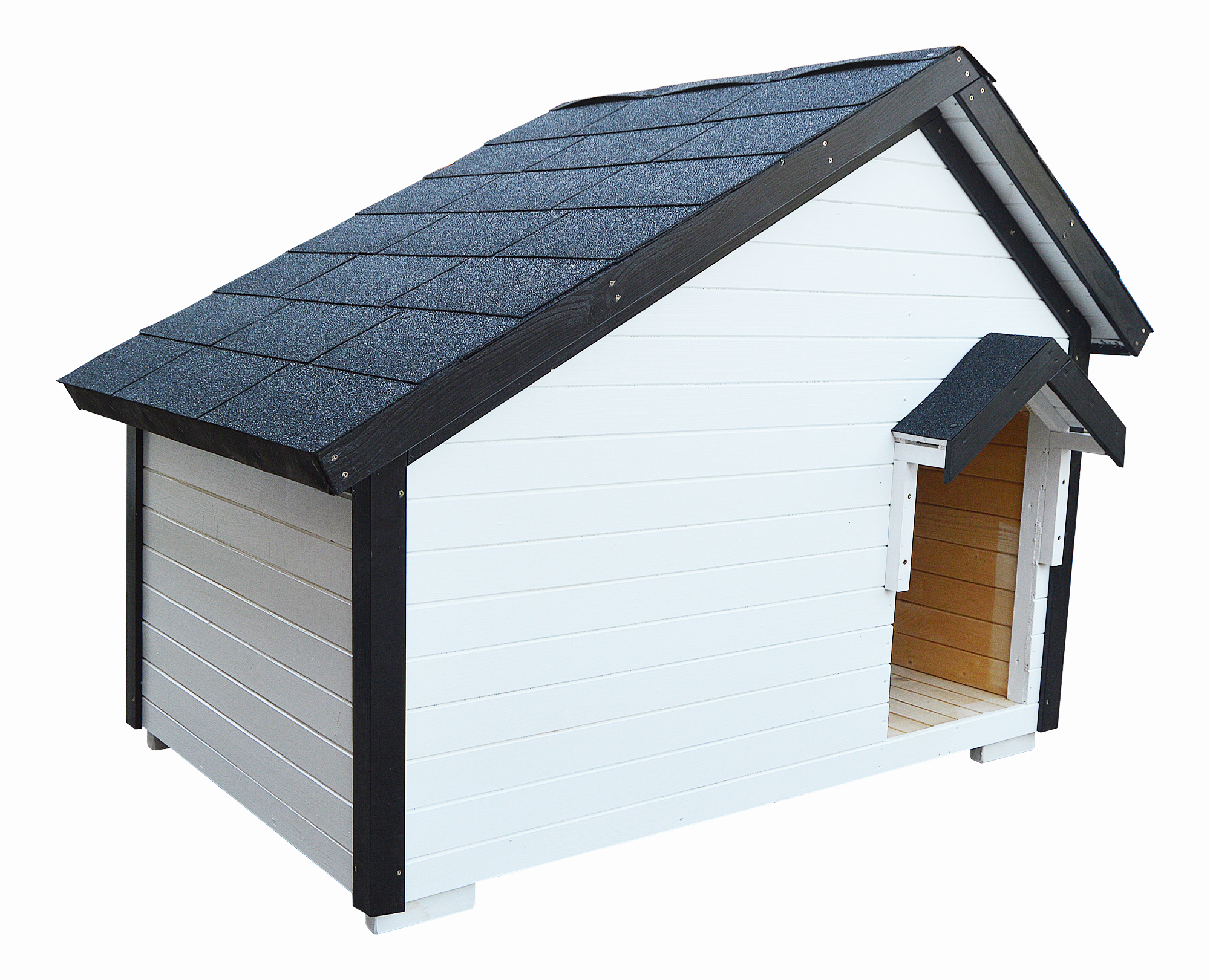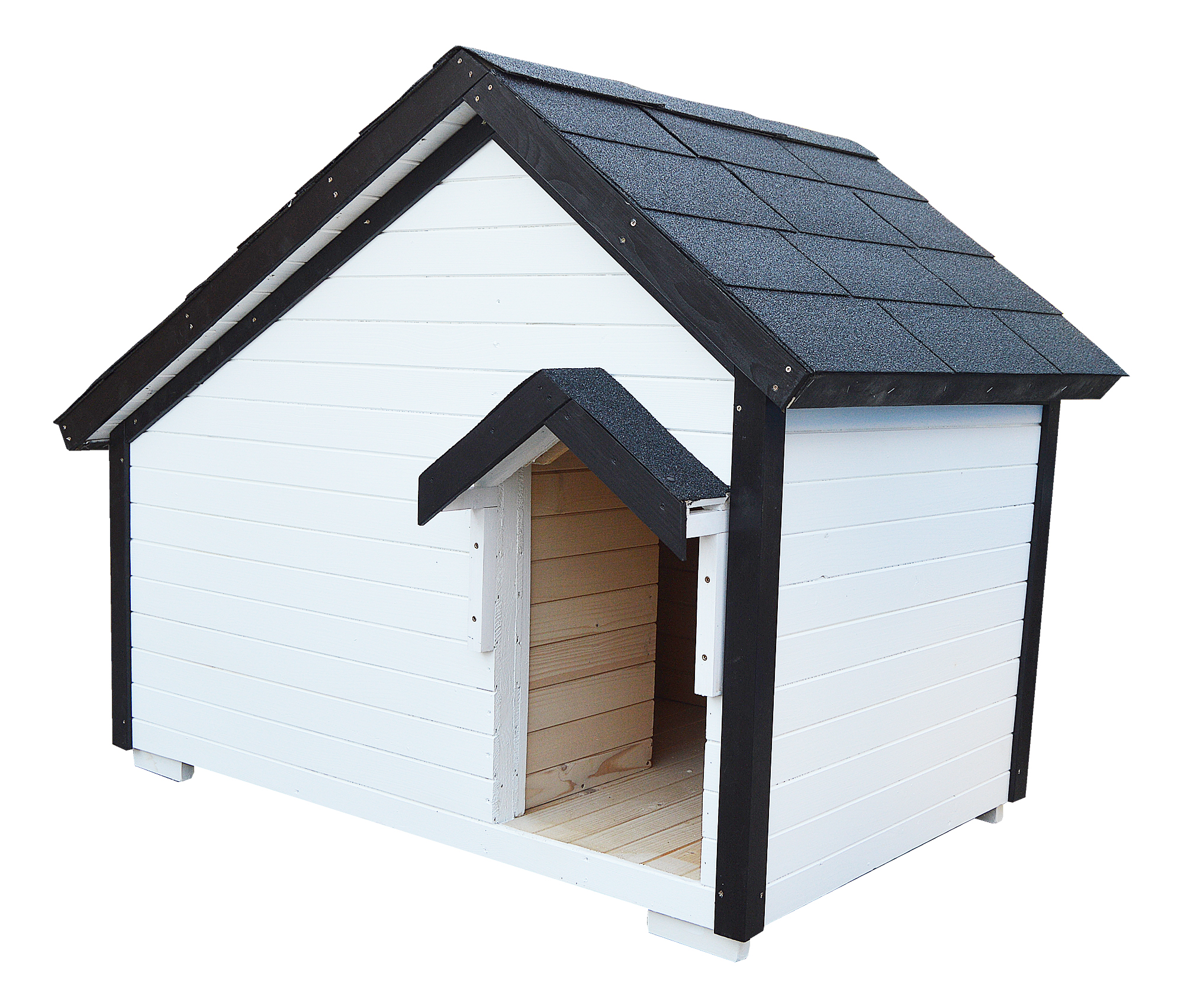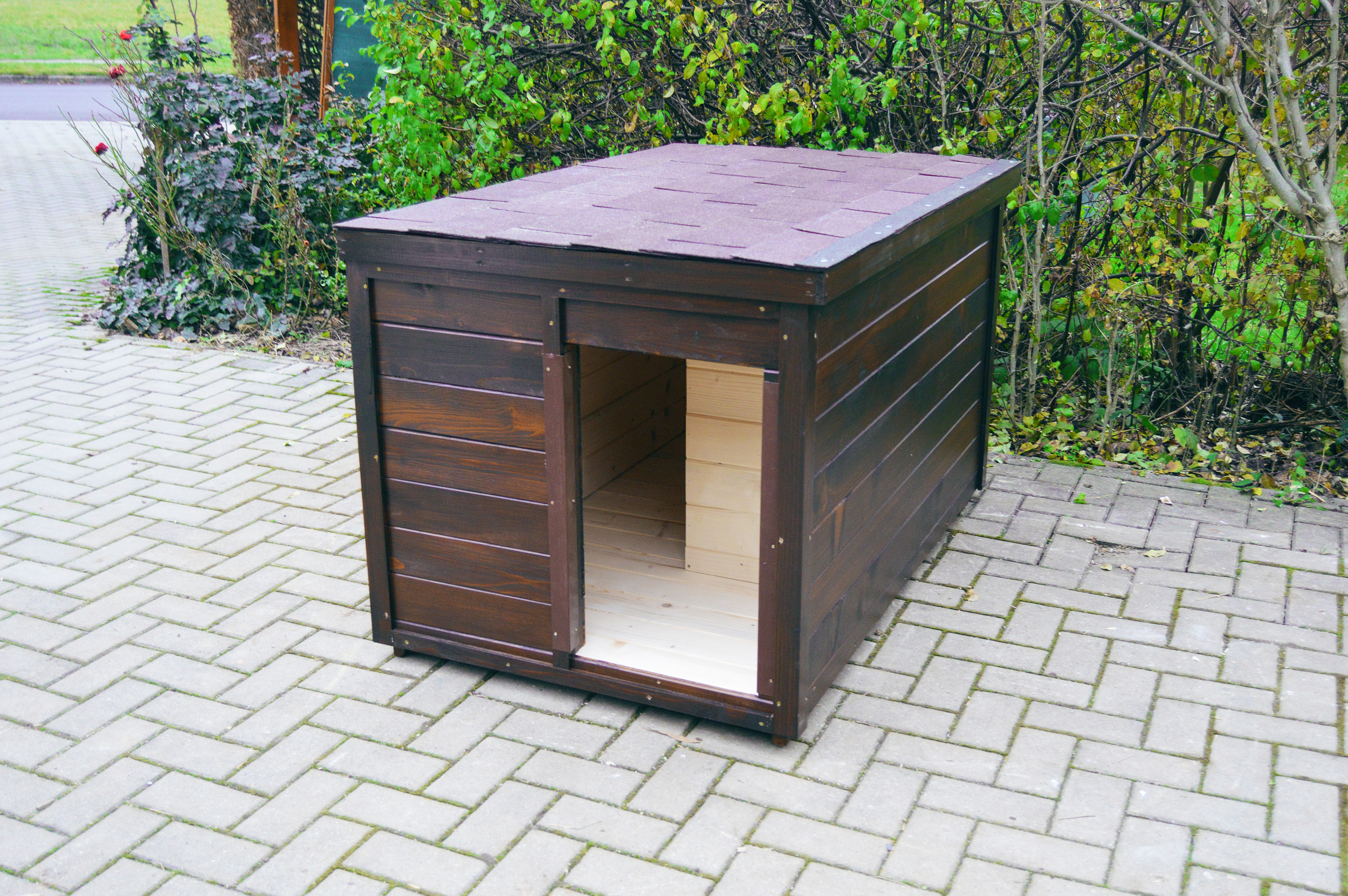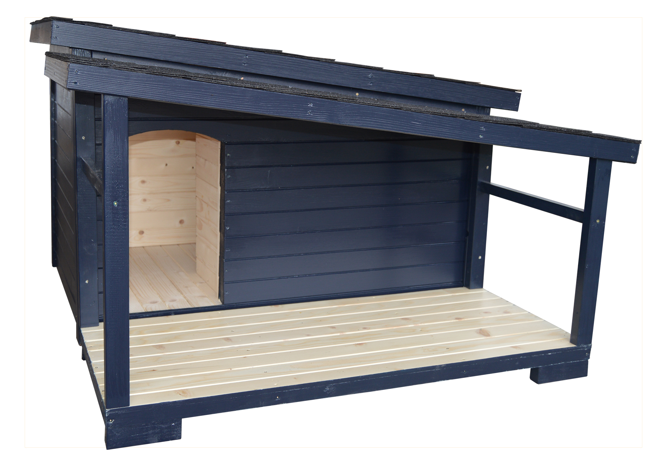 Pozrite si Zateplenú búdu pre psa MAXIM so šikmou strechou so sklonom do strany, tmavou krytinou, oplechovaním vchodu a menovkou v šedom odtieni RAL 7040 #4.