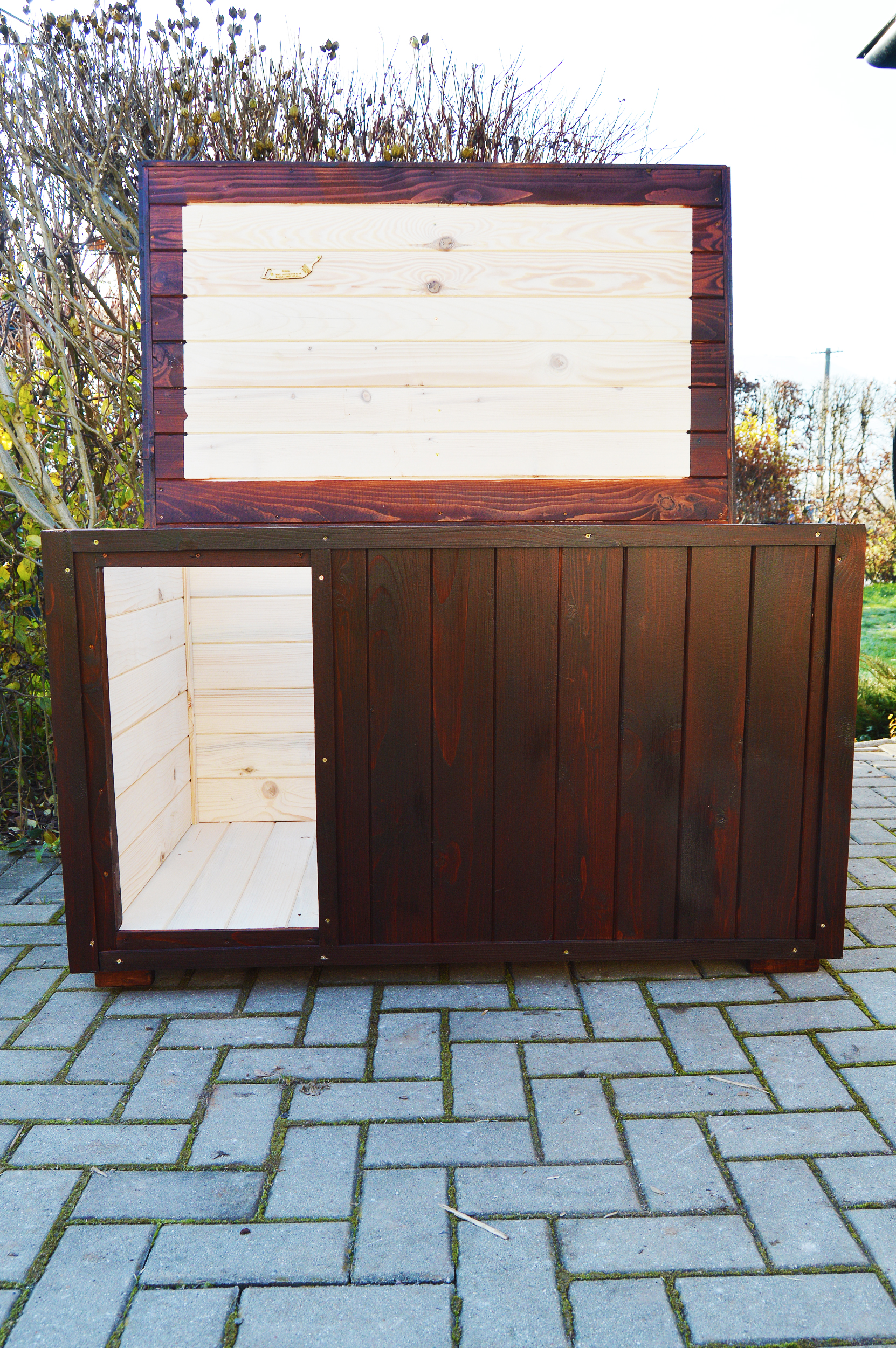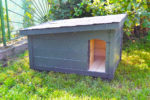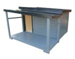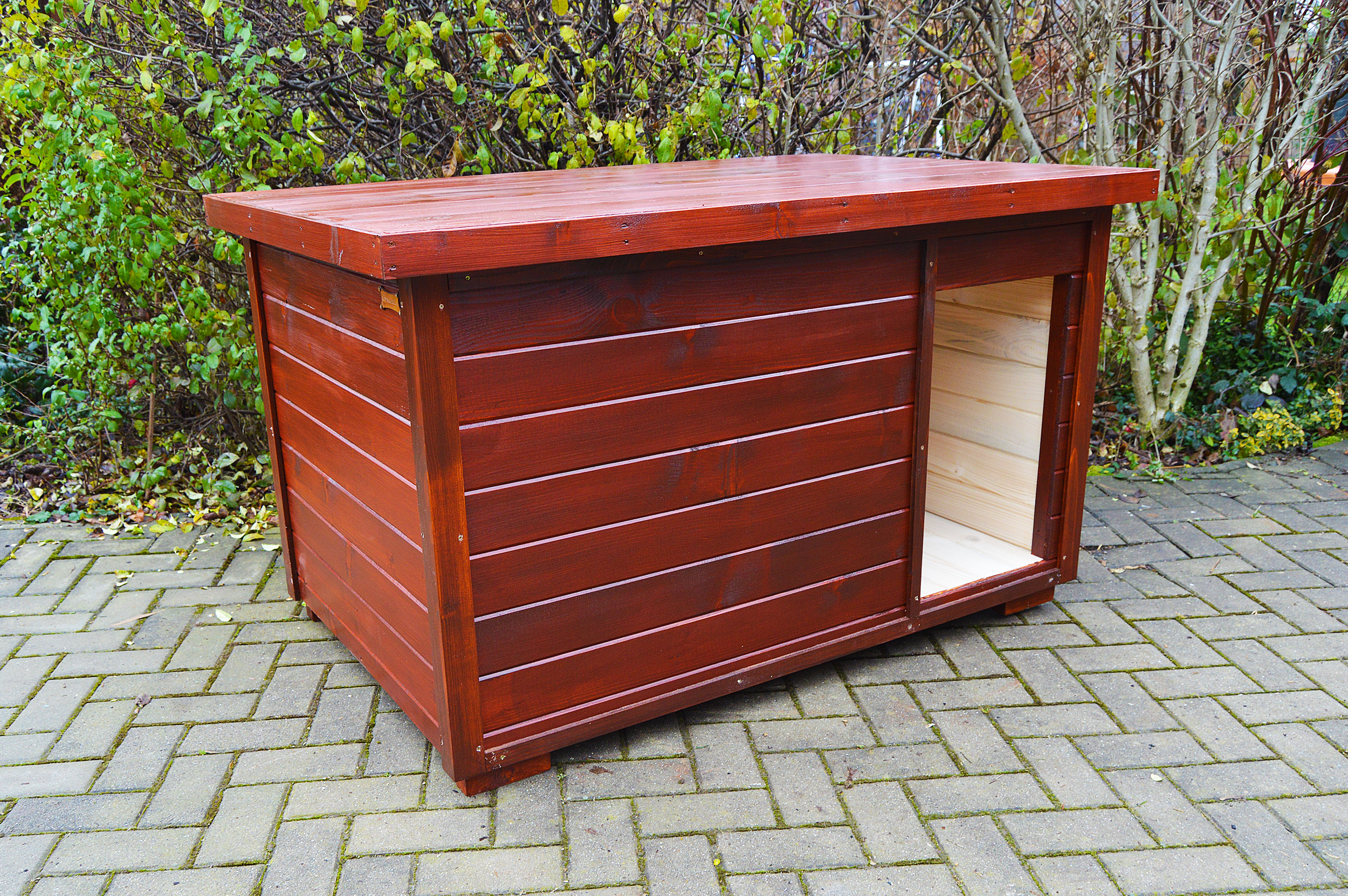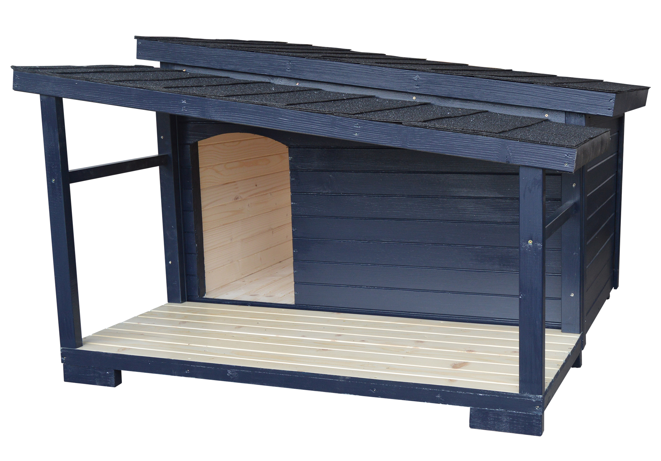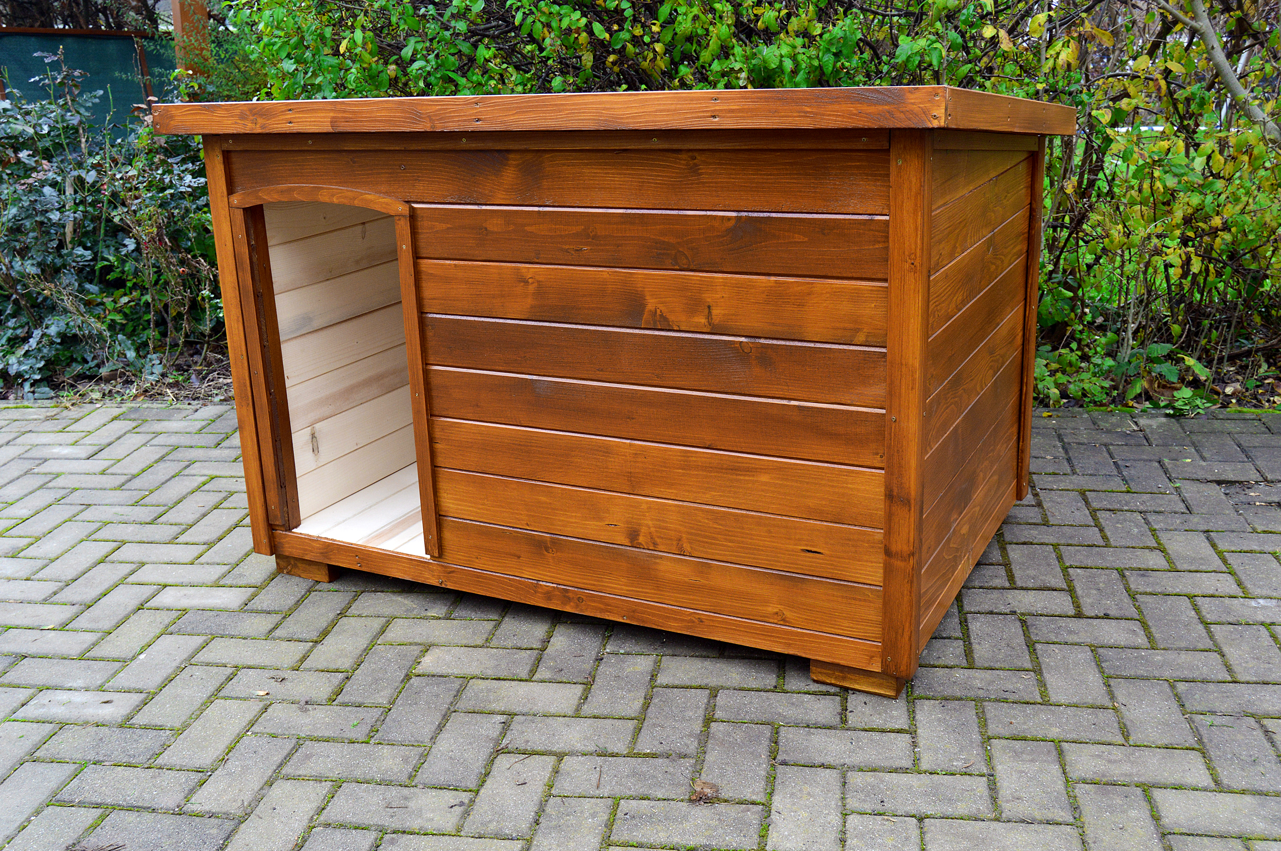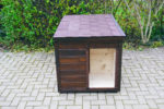 Pozrite si Zateplenú búdu pre psa MAXIM so šikmou strechou so sklonom do strany, tmavou krytinou, oplechovaním vchodu a menovkou v šedom odtieni RAL 7040 #4.